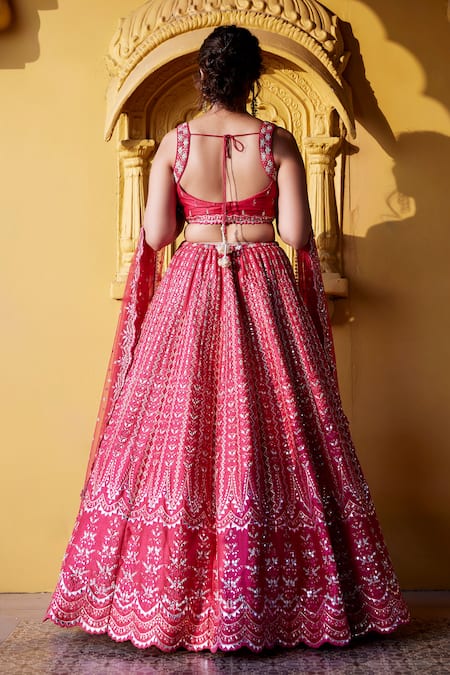Rani pink lehenga featuring geometric mirror, leather, and resham embroidery. Paired with an embroidered padded blouse and a scallop-edged tulle dupatta.