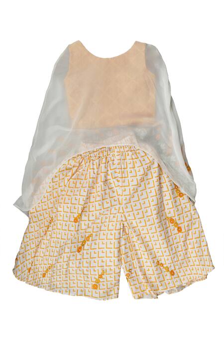 Embroidered floral motifs on cape and palazzo, Printed geometric pattern on palazzo, Pearl embellishments on embroidery