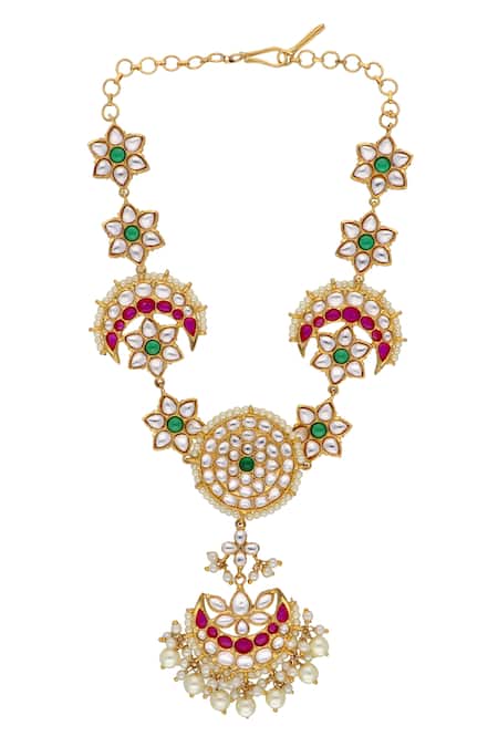Crescent moon shape drop design, Kundan and pearl highlights, 22k gold toned finish