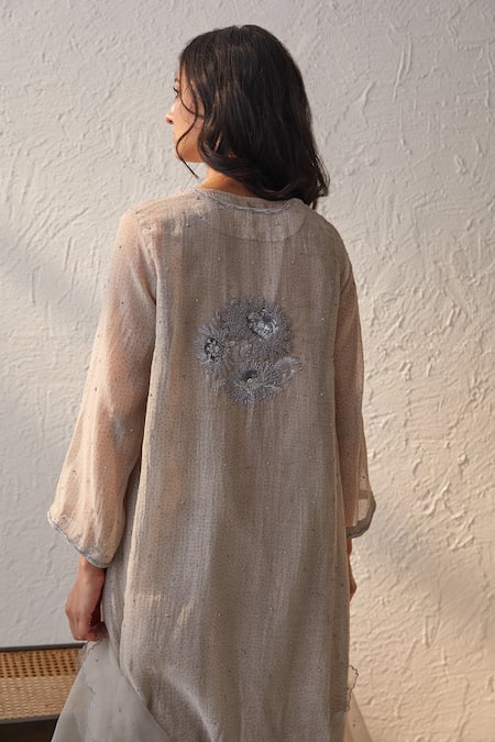 Grey chanderi kurta featuring a notched round neck and all-over polka dot pattern with tonal dabka, dori, and sequin embroidery. Paired with a trouser, an embroidered dupatta, and an inner slip.