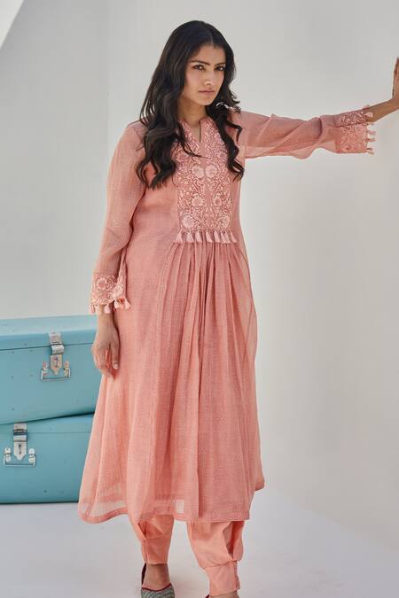 Peach chanderi kurta featuring a notched round neck, full sleeves, and gathered details. Paired with a salwar showcasing a tapered border.