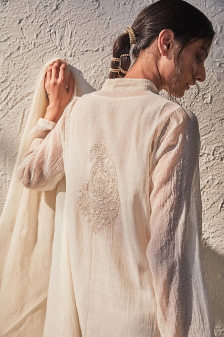 Ivory chanderi kurta featuring an all-over polka dot pattern with tonal paisley motifs and dori embroidered borders. Paired with satin Afghani salwar, dupatta, and an inner slip.