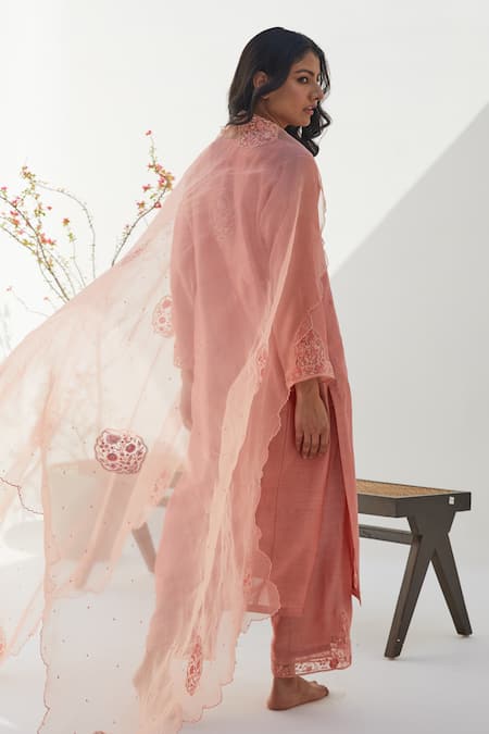 Peach Chanderi Embroidered Dori V Neck Kurta Set