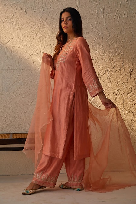Peach Chanderi Embroidered Dabka And Sequin Work Notched Round Kurta Palazzo Set