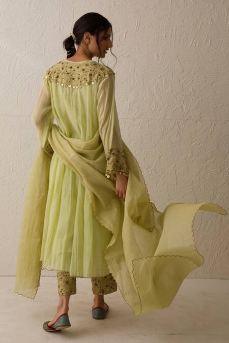 Lime green chanderi anarkali featuring a V neck and full sleeves with monochrome dabka, zari, and coin tassel embroidery on the yoke and sleeve borders. Paired with embroidered trousers and a dupatta with scalloped cut work hem and an inner slip.