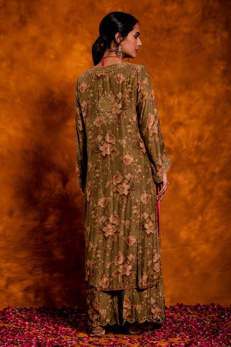 Olive kurta with floral print & dabka, sequin embroidered neckline. Paired with palazzo & dupatta.