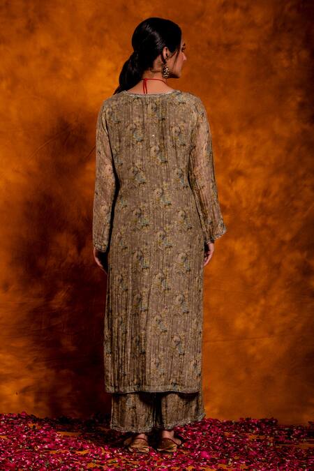 Grey kurta with floral print & dabka, sequin embroidered neckline. Paired with palazzo & dupatta.