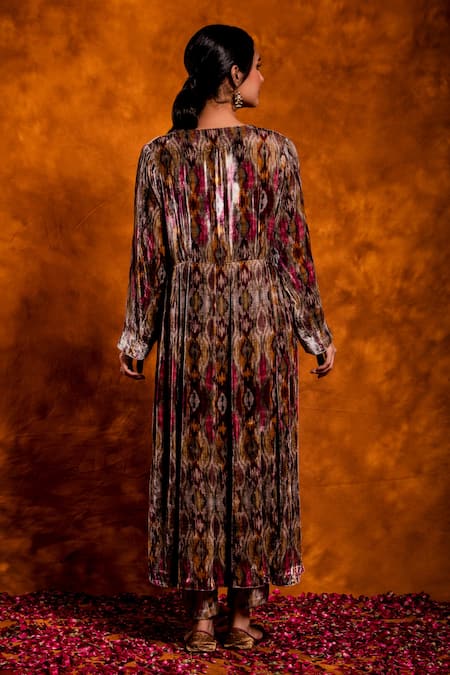 Multicolor jacket style kurta with ikat print & V neckline. Paired with pant.