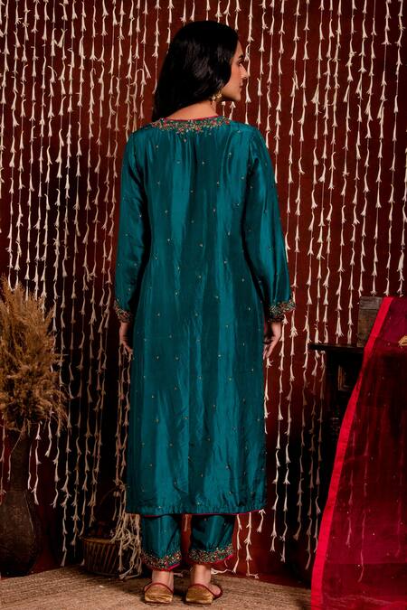 Blue Kurta And Pant Silk Embroidery Zardozi Notched Set