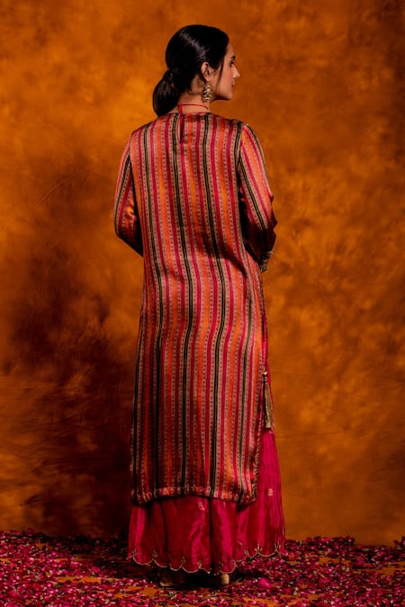 Fuchsia kurta with stripe print & gota, dabka embroidered neckline & sleeve hem. Paired with palazzo & dupatta.