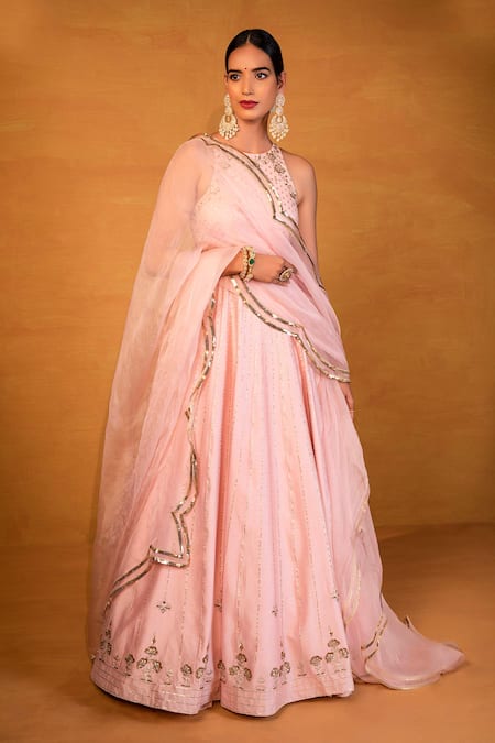 Blush pink chanderi anarkali, embellished in gota, nakshi and sequins. Paired with a matching organza dupatta.