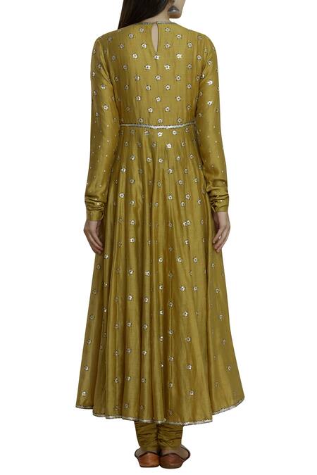 Mustard yellow anarkali with all-over floral motif work. Comes with plain churidar & embellished dupatta.