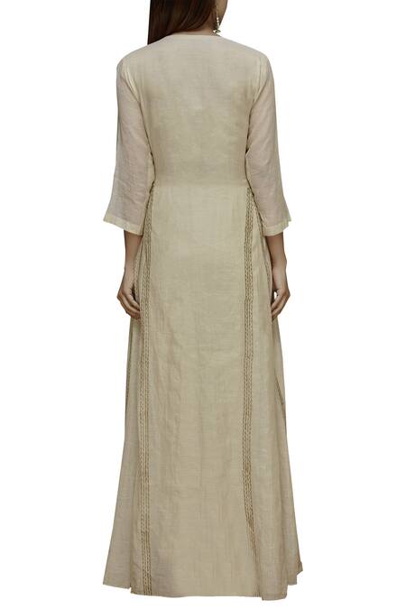 Off white Chanderi angrakha anarkali with block printed kali & embroidered neck. Comes with straight pants.