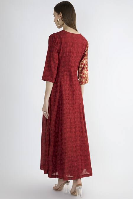 Maroon Chanderi angrakha anarkali paired with leggings.