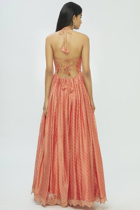 Orange halter neck anarkali with Bandhani print & embellished lace trims. Comes with net dupatta.