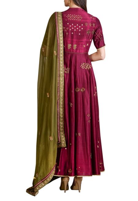 A wine anarkali featuring based in chanderi enhanced with hand embroidered motif in gold accents. It is paired with a churidar and an olive green embellished dupatta with border detail. It fits true to its style.