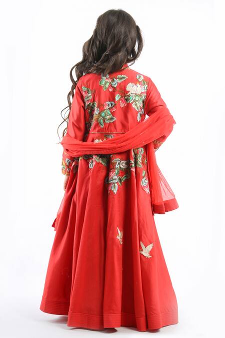 Red anarkali featuring floral and bird resham thread embroidery. Paired with a sheer dupatta.