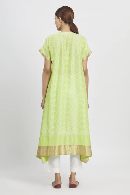 Lime asymmetric chanderi tunic with zig zag block print, front tie-up & placement floral embroidery.