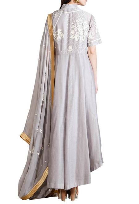 Buy_Sahil Kochhar_Grey Chanderi Floral Motifs Mandarin Collar Asymmetrical Kurta Set_at_Aza_Fashions