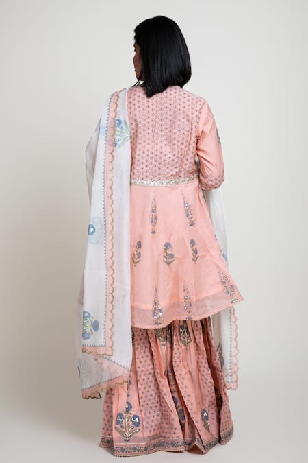 Peach block print kurta with foil print and embroidered detail. Paired with a printed gharara and dupatta.