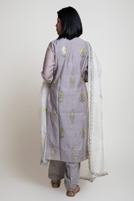 Grey block print kurta with foil print detail. Paired with a printed salwar and dupatta.