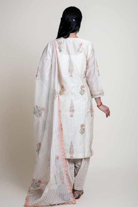 Ivory block print kurta with foil print detail. Paired with a printed salwar and dupatta.