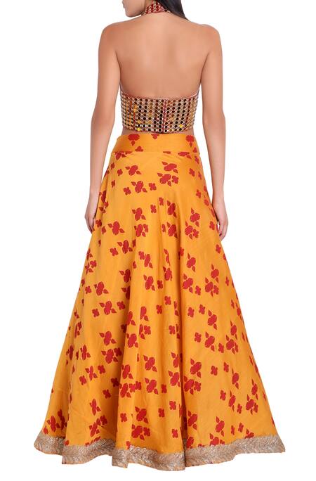 Yellow Chanderi Halter Neckline Block Print Lehenga Set