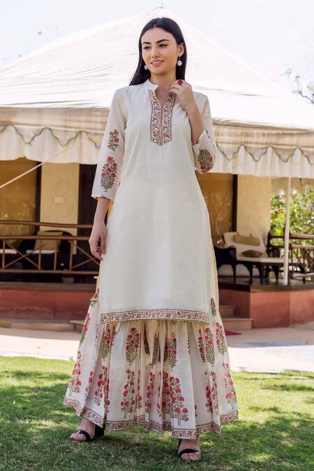 Ivory chanderi kurta in floral block print. Paired with a cotton printed sharara.