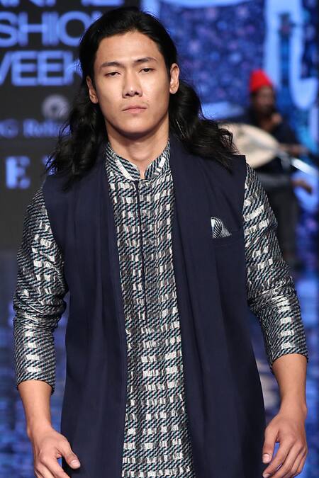 Blue straight kurta with printed motifs & zari embroidery paired with denim shawl collar Nehru jacket. Comes with denim pants.