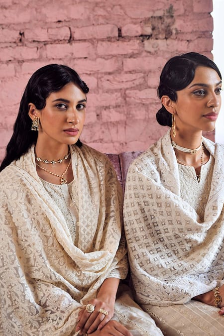 Ivory chikankari embroidered straight kurta featuring a round neckline and straight three quarter sleeves. Paired with cotton pants and a chiffon dupatta adorned with floral patterns and sequin highlights.