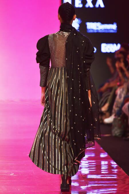 Black angarkha style kurta with exaggerated puffed sleeves. Paired with Chanderi churidar & embellished dupatta.