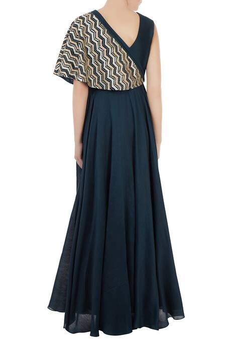 Dark blue anarkali with thread & sequin work embroidered bodice. Comes with an added tie-up cape layer on one side with bead work.