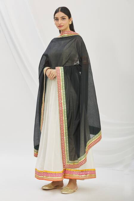 Black chanderi dupatta with embroidered multicolour border in sequin work.