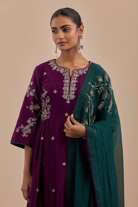 Green chanderi dupatta with floral embroidery & contrast hem.