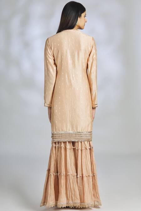 Peach kurta with placement floral butti motif embroidery. Comes with sharara & dupatta.