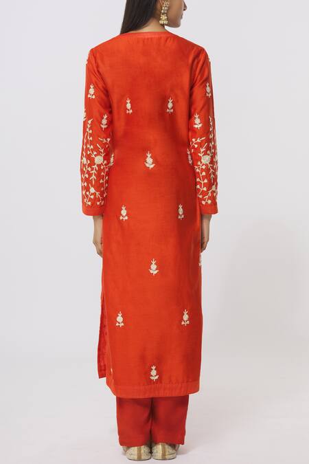 Brick red long kurta with gota work floral bel motifs. Comes with pants & sheer dupatta.