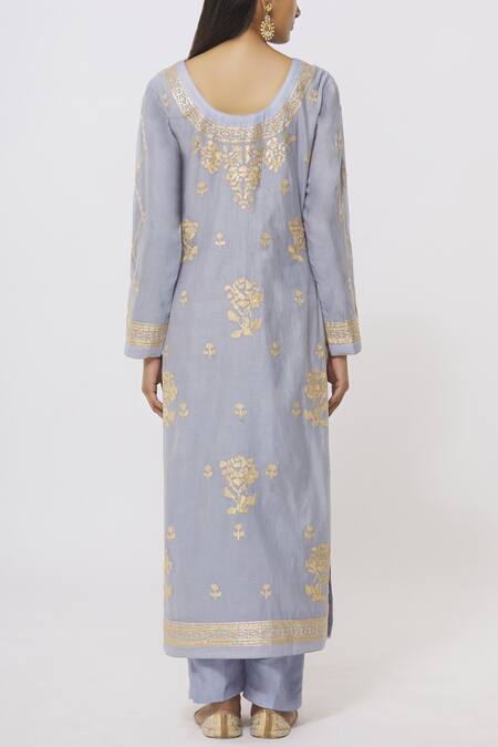 Smokey blue long kurta with gota work floral butis. Comes with pants & sheer dupatta.