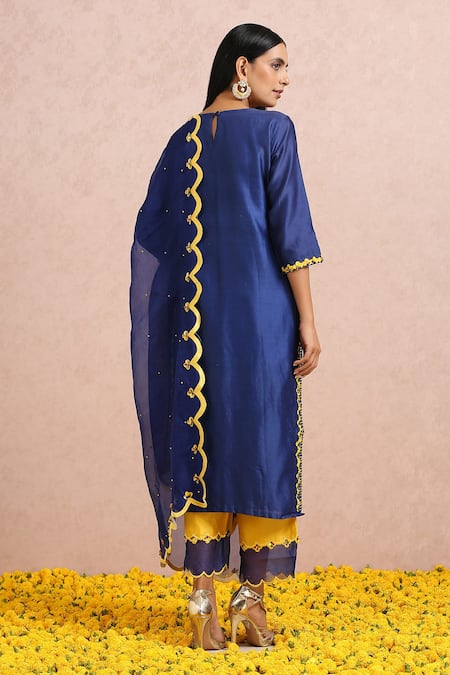 Ink blue chanderi kurta with round neck, gota hand embroidered yoke, sequin & bead work border. Paired with contrast pants & silk organza dupatta with scalloped hem border.