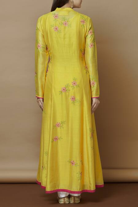 Yellow jacket style long kurta with placement floral motif work. Comes with inner slip.