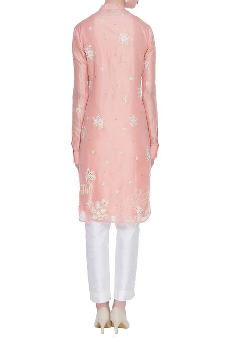 Buy_Sahil Kochhar_Peach Band Collar Chanderi Embroidered Kurta _Online_at_Aza_Fashions