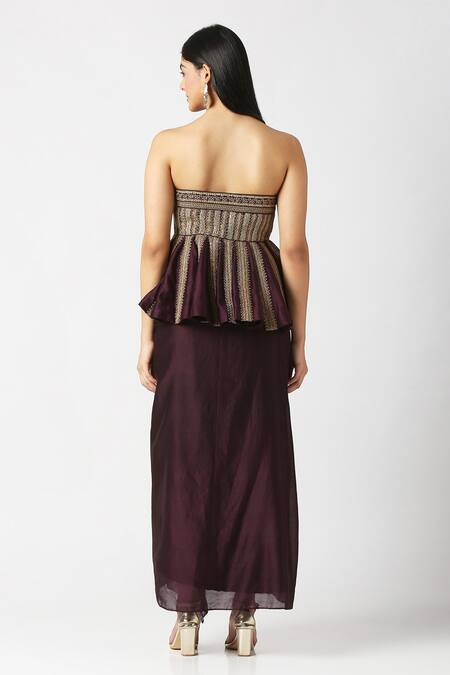 Berry purple strapless peplum top featuring hand embroidered marodi work on all panels. Paired with a side slit skirt adorned with frills on the front.