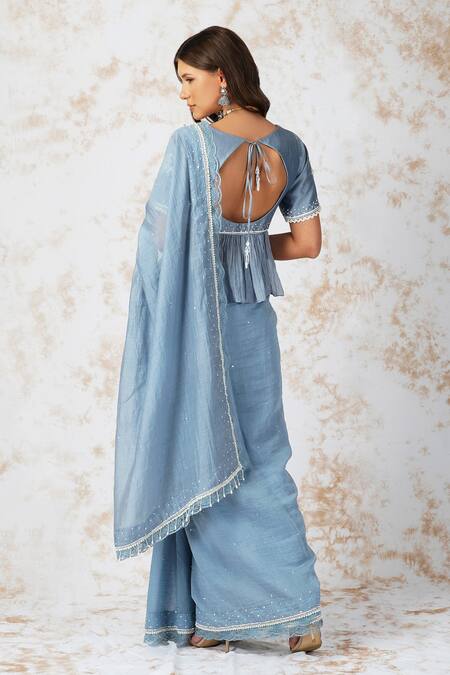 Pigeon blue chanderi embroidered saree with lace work border. Comes with unstitched blouse fabric.