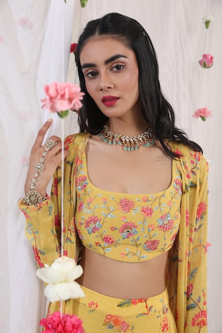 Buy_Esha Koul_Yellow Chanderi, Semi Crepe Floral Motifs U Neck Embroidered Blouse_at_Aza_Fashions