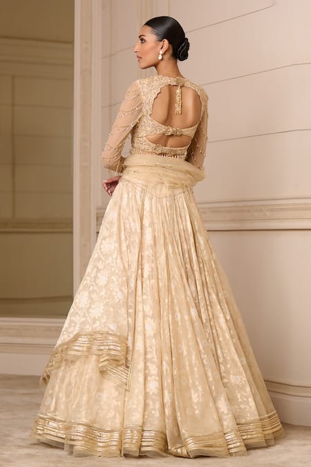 Gold lehenga featuring floral embroidery and layered design. Paired with a hand-embroidered georgette blouse and a crystallized tulle scarf.