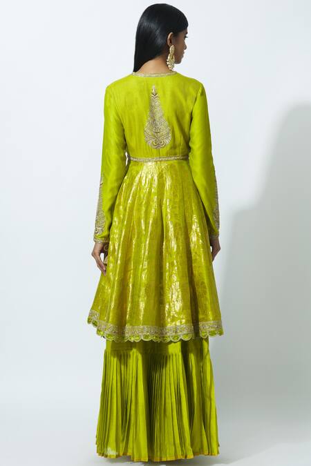 Lime green anarkali with woven & embroidered detail. Comes with pleated skirt & scallop hem dupatta.