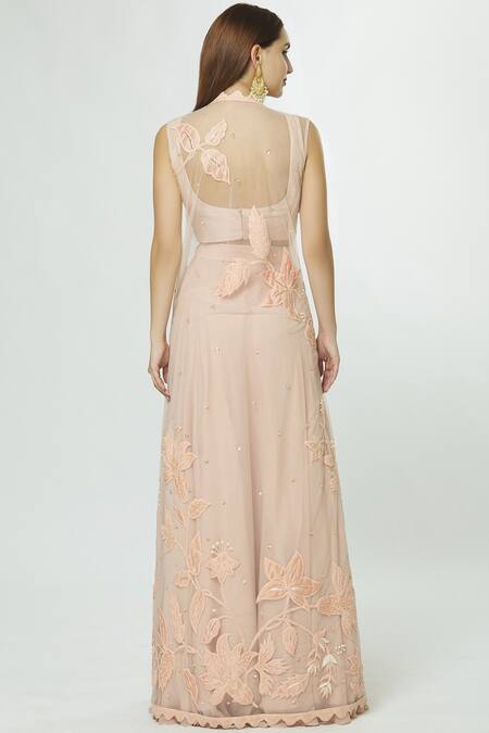 Peach blouse with all over bead embellished floral motifs. Comes with sheer applique jacket & lehenga.