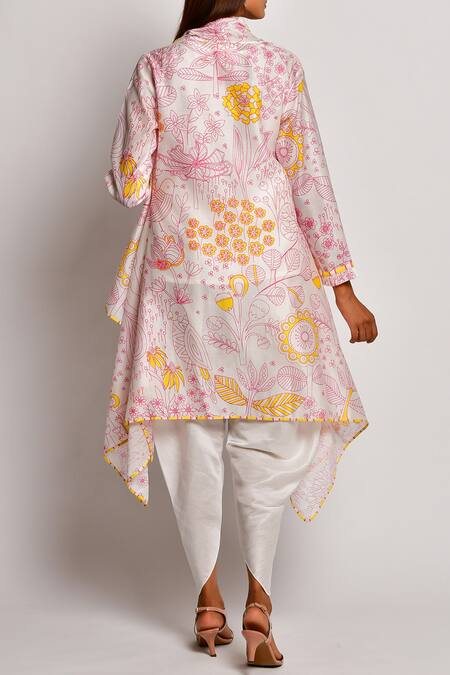 Off white Chanderi jacket with floral printed motifs & asymmetrical hem. Paired with dhoti pants & inner.