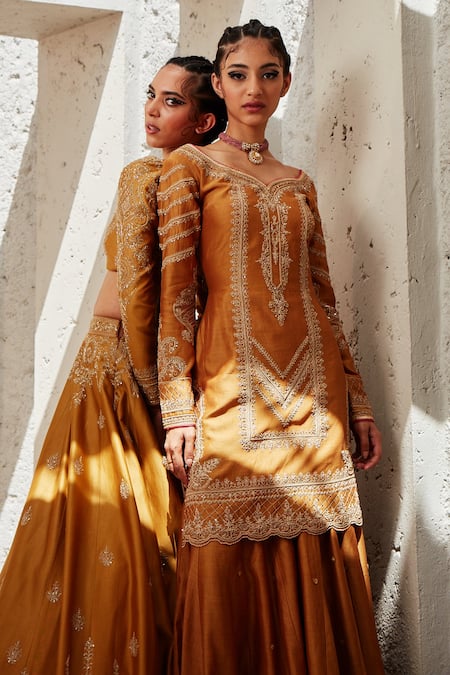 Mustard kurta with gold aari, dori and sequin embroidery. Comes with sharara.