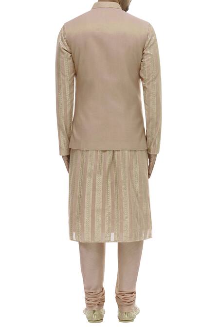Baby pink kurta with striped woven detail all over. Comes with matching churidar, green Nehru jacket & pocket square.