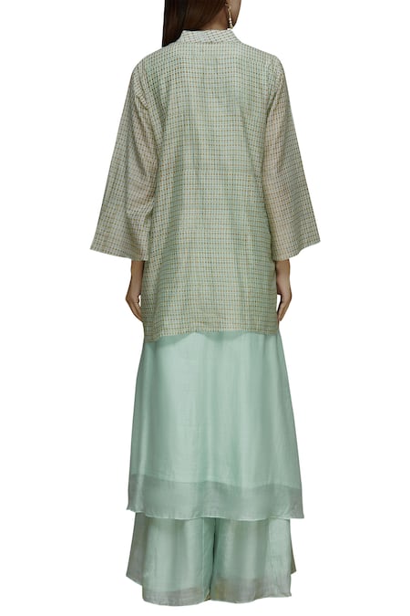 Powder blue Chanderi kurta paired with palazzo. Comes with printed open jacket.